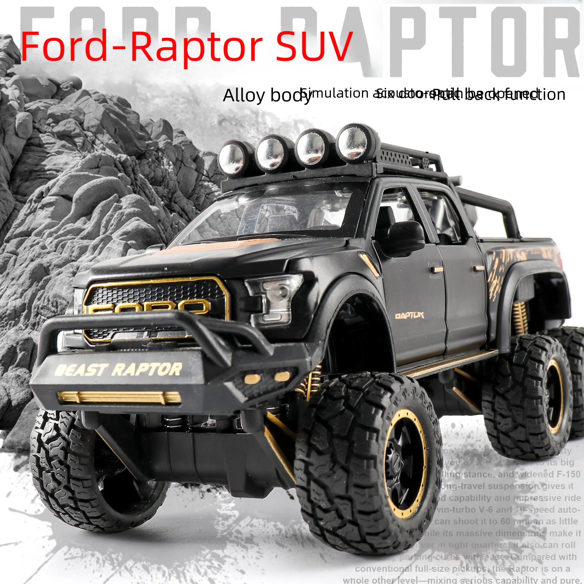 Rev up your collection with this stunning 1:24 scale Raptor F150 Off-Road Alloy Toy Car. Crafted from high-quality alloy plastic, this intricate model is not just a toy; it’s a piece of art that any car enthusiast would love to own.